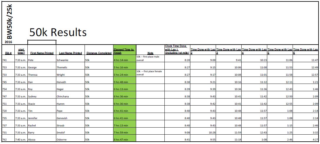 | Finishers: | 12 (6 M, 6 F) | Multiple Finishers. |